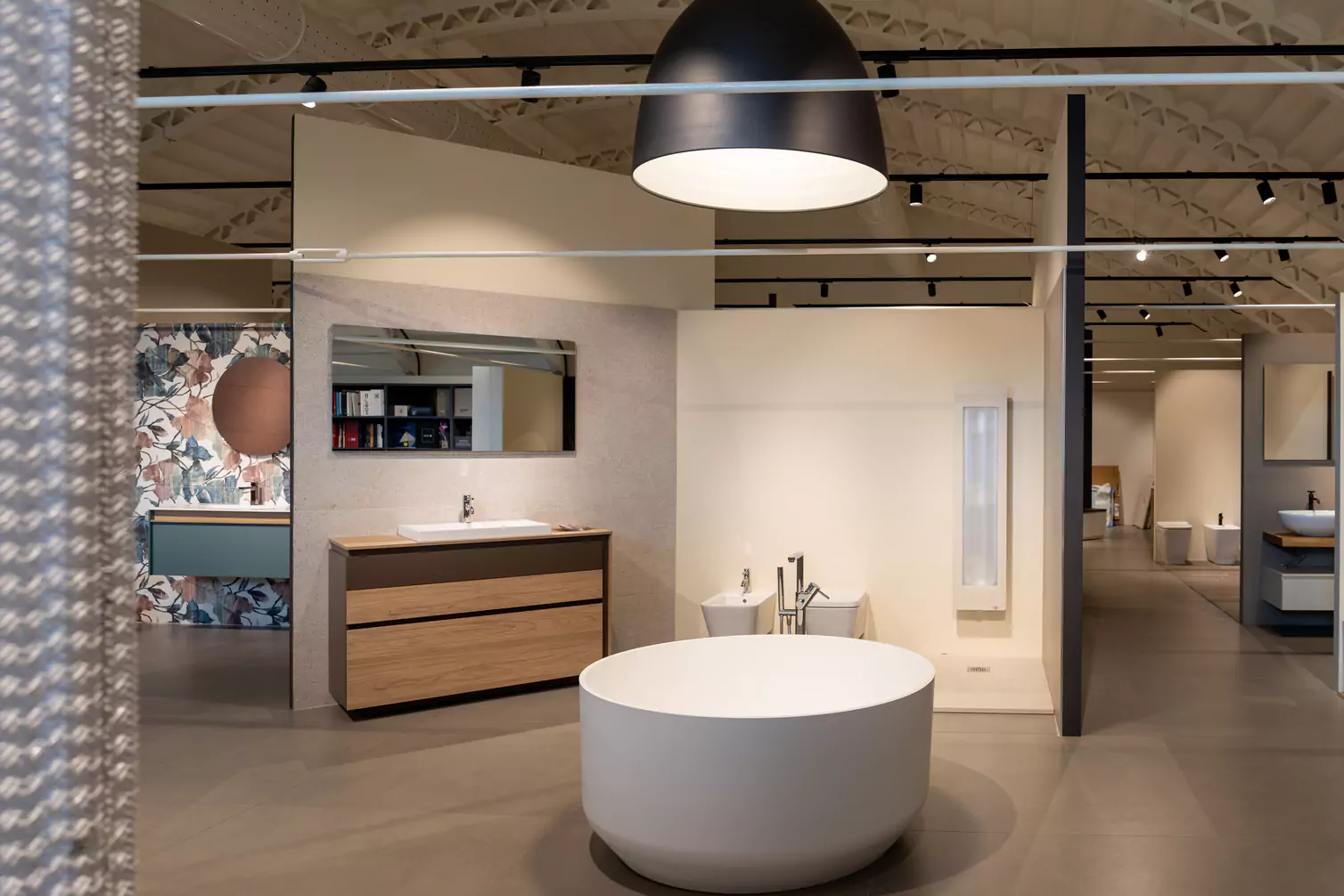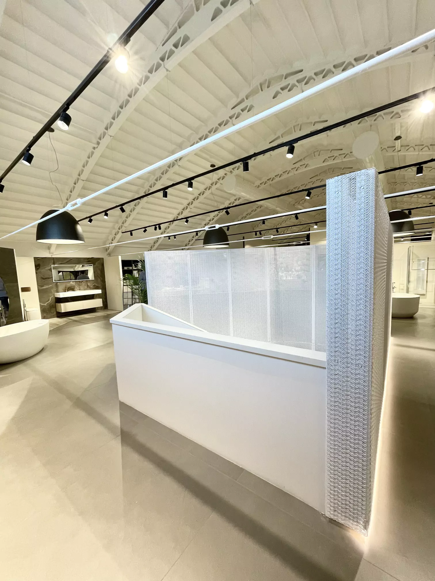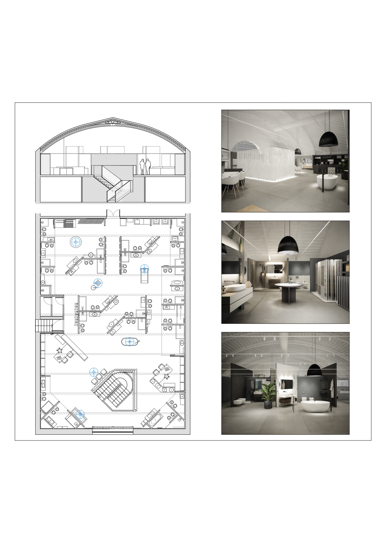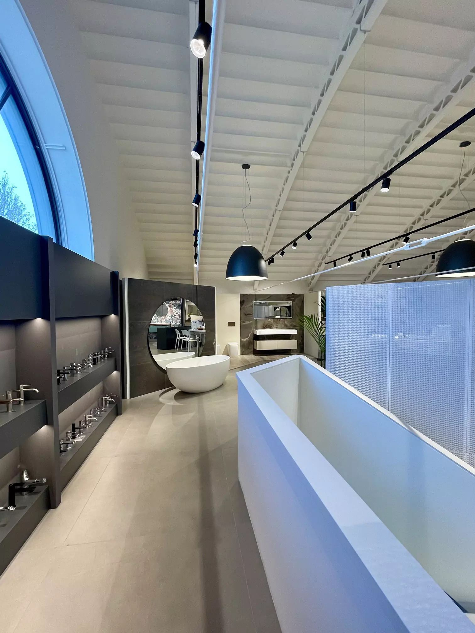 Filiale di una azienda specializzata nella vendita di superfici, arredobagno e living, al primo piano di uno spazio caratterizzato dal soffitto curvo a travetti in c.a., che si è voluto mantenere e riqualificare. L’accesso allo showroom avviene attraverso una scala (originariamente in ferro) le cui pareti sono state rivestite in pannelli di lamiera microforata e retroilluminata: la scala diventa un volume semitrasparente visibile da ogni angolo dello showroom. L’altezza del soffitto ha suggerito l’utilizzo di lampade a sospensione di dimensione importante in abbinamento al sistema di proiettori su binario per l’illuminazione d’accento.