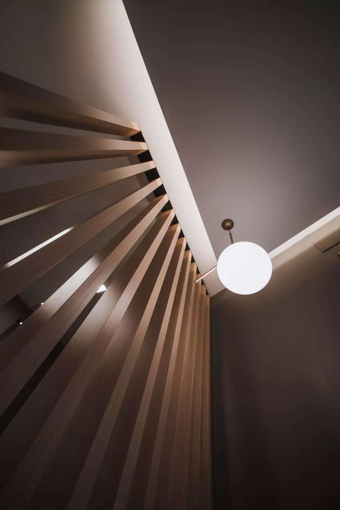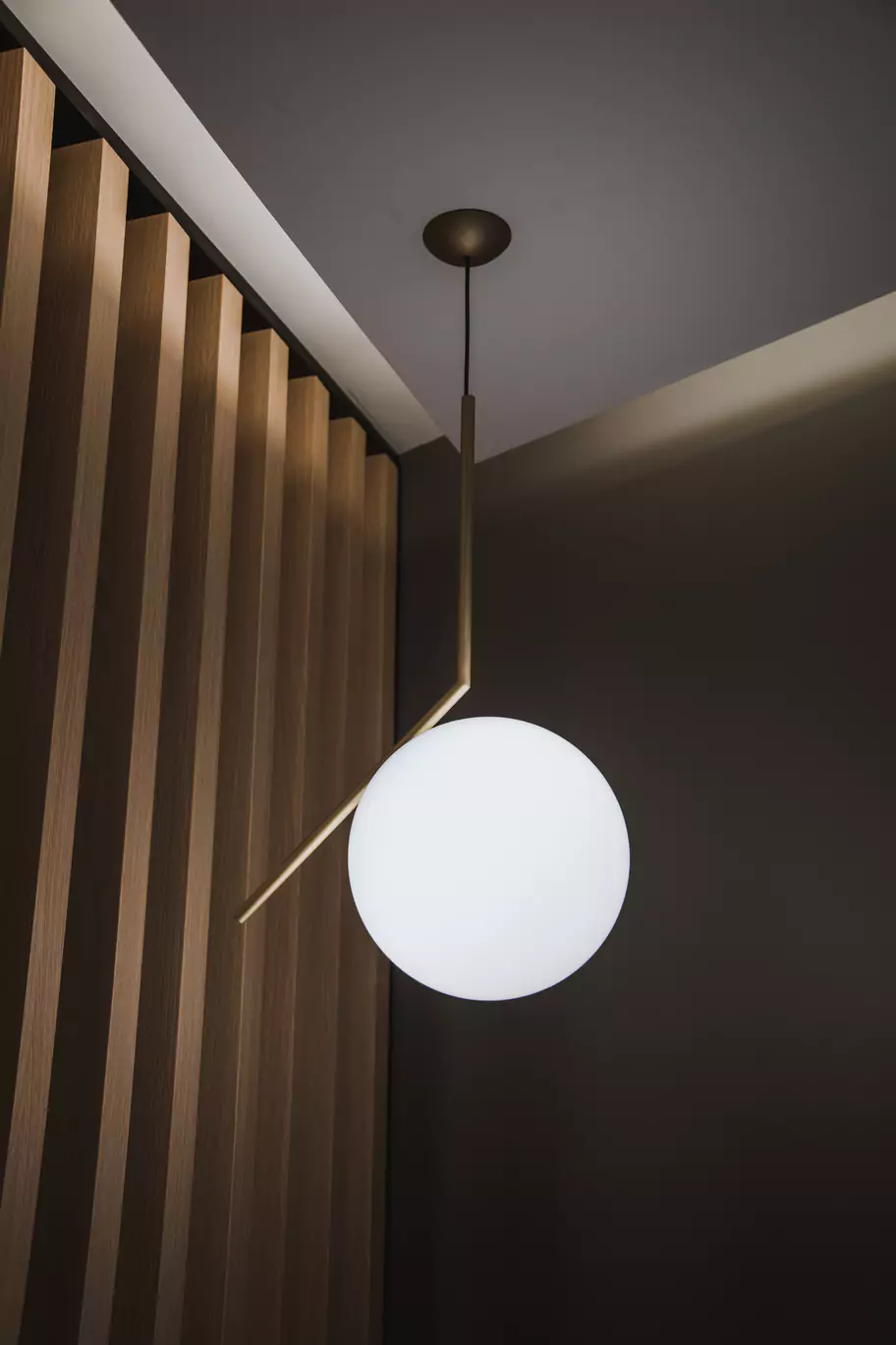 Prevalenza di toni del grigio, per meglio evidenziare i rivestimenti ceramici, illuminazione d’accento con proiettori su binario.